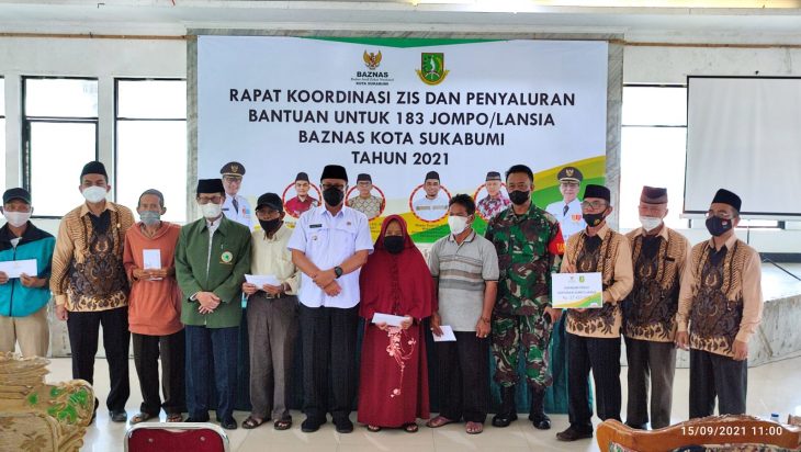 Sukabumi,PUBLIKASI-Badan Amil Zakat Nasional(BAZNAS) Kota Sukabumi melakukan rapat koordinasi dengan UPZ(ZIS) se-kota Sukabumi serta silaturahmi dengan pimpinas Baznas periode 2021-2026 serta memberikan bantuan kepada jompo (lansia) sebanyak 183 orang penerima manfaat,kegiatan tersebut bertempat di Gedung Pusat Kajian Islam kota Sukabumi dengan menerapkan prokes, Rabu 15 September 2021, bantuan tersebut di serahkan secara simbolis kepada perwakilan penerima bantuan oleh Walikota Sukabumi Ahmad Fahmi.