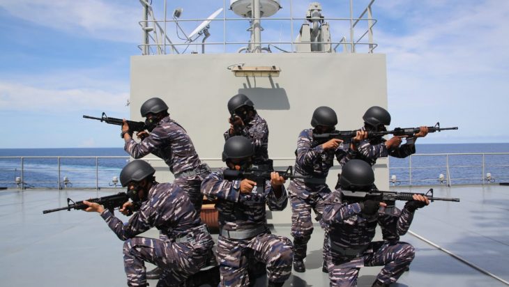 Mereka berlatih simulasi pelumpuhan perompak di lounge room dan latihan menembak di atas geladak KRI Banjarmasin 592.