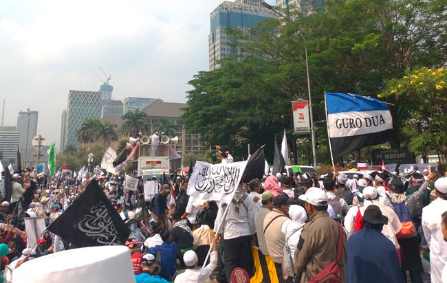 Sejumlah atribut seperti poster hingga Bendera Tauhid juga nampak dibawa massa aksi. Mereka juga sempat meminta agar diperbolehkan melewati blokade menuju kawasan Patung Kuda yang berada di luar sisi sebelah barat kawasan Monas itu.