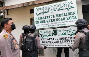 Jakarta, PUBLIKASI – Polisi menurunkan plang dan spanduk organisasi Khilafatul Muslimin di Kecamatan Polokarto, Sukoharjo, Jawa Tengah, pada Kamis (9/6). …