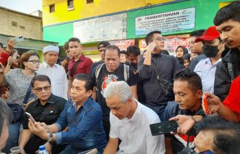 Jakarta, PUBLIKASI — Ketua Umum Organisasi Posko Perjuangan Rakyat (Pospera), Mustar Bona Ventura Manurung bersama Ganjar Pranowo blusukan di Pasar …