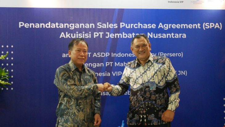 Jakarta, PUBLIKASI – PT ASDP Indonesia Ferry (Persero) secara resmi telah mengakuisisi PT Jembatan Nusantara, salah satu perusahaan ferry swasta di Tanah Air melalui Penandatanganan Sales Purchasement Agreement (SPA) PT Jembatan Nusantara antara PT ASDP Indonesia Ferry (Persero) dengan PT Mahkota Pratama dan PT Indonesia VIP selaku pemilik saham PT Jembatan Nusantara, di Jakarta.