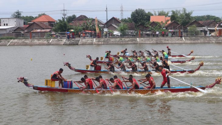 Tampak di kejauhan para atlet dayung Satlinlamil 2 mengayuh dayungnya dengan penuh semangat sesuai dengan irama yang dimainkan oleh penggebuk drum. Sampai akhirnya perahu naga tim Satlinlamil 2 mencapai garis finish.