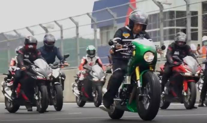 Jokowi lalu berpose sambil duduk di atas motor lalu berfoto bersama dengan para pembalap yang hadir. Sesi foto bersama kembali dilakukan di depan Istana Merdeka.