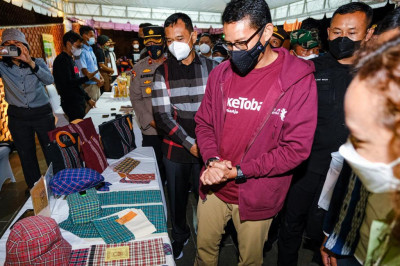 Menparekraf Sandiaga saat meninjau pameran UMKM di Pantai Bebas Parapat Danau Toba, Selasa (22/3/2022), mengapresiasi kualitas produk-produk ekonomi kreatif yang ada di Pameran UMKM Danau Toba.