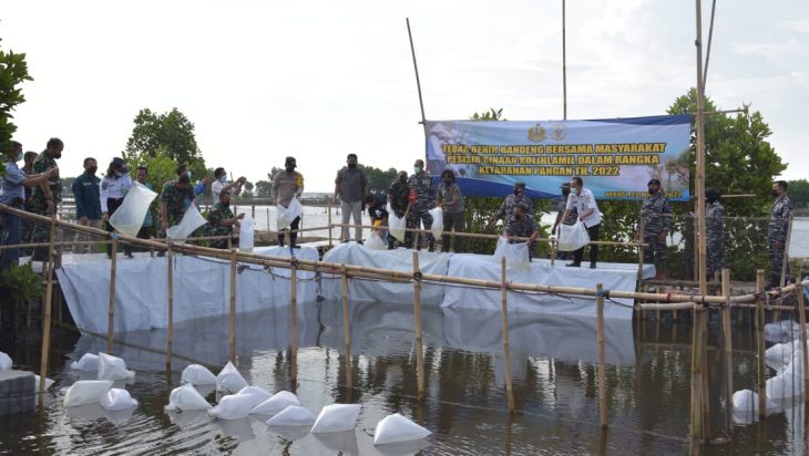 Jakarta, PUBLIKASI – Komando Lintas Laut Militer melalui Staf Potensi Maritim melaksanakan penebaran benih ikan bandeng dalam rangka mendukung Pemerintah terkait program ketahanan pangan nasional yang digelar di tambak nelayan Desa Segara Jaya, Kecamatan Taruma Jaya, Kabupaten Bekasi.