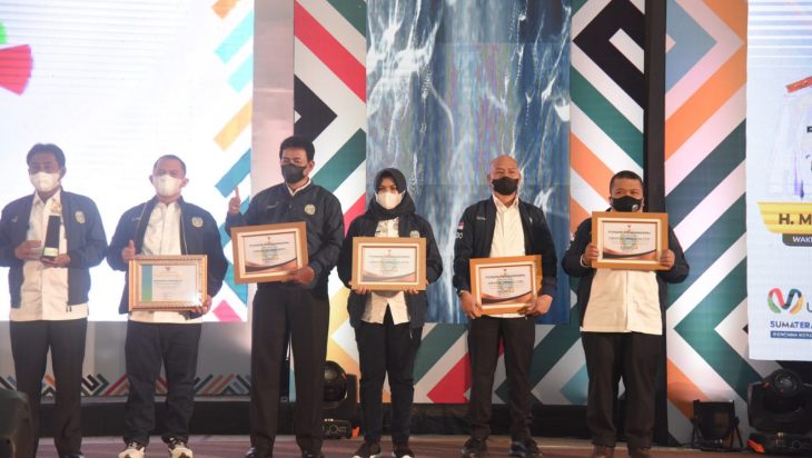 Setelah itu Gubernur Sumut Edy Rahmayadi memberikan penghargaan kepada Bupati Tapsel atas pencapaian sebagai 10 kabupaten/kota terbaik se Sumatera Utara dalam realisasi anggaran belanja tahun anggaran 2021. (HASIM)