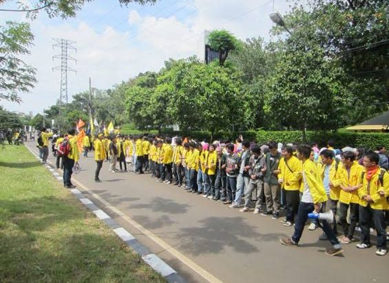 Mahasiswa tak bisa masuk ke halaman Balai Sidang. Aparat pengamanan UI mengadang puluhan mahasiswa di jalan depan Balai Sidang UI.