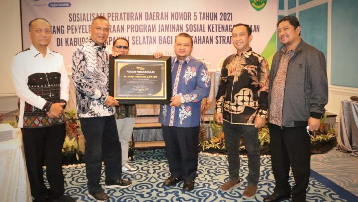 Penghargaan tersebut diserahkan Deputi Direktur BPJS Ketenagakerjaan Wilayah Sumbagut, Panji Wibisana, kepada Bupati Tapsel H Dolly Pasaribu, S.Pt, MM pada acara sosialisasi Perda No.5/2021 terhadap sejumlah pimpinan perusahaan di Tapsel yang digelar di Aula Hotel Adimulia Kota Medan, pada Selasa (5/7) malam.