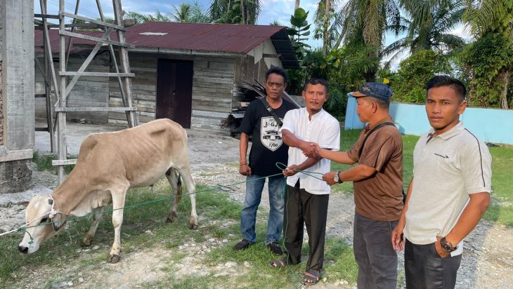 Hewan qurban satu ekor lembu tersebut diserahkan oleh perwakilan keluarga besar Bapak H.Ngongesa Sitepu kepada perwakilan pengurus Mesjid Taqwa Desa Teluk Meku, Pono (47)