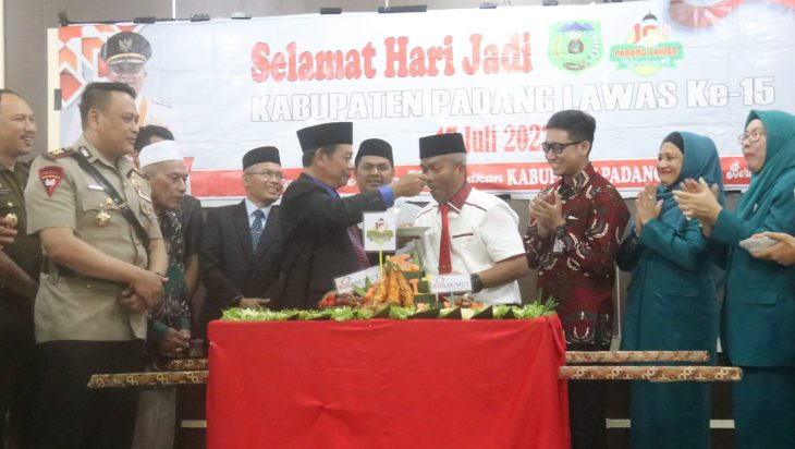 Padang Lawas, PUBLIKASI – Memperingati Hari Jadi Kabupaten Padang Lawas (Palas) yang ke 15, tahun 2022, terlihat Pelaksana Tugas (Plt) Bupati Padang Lawas H.Ahmad Zarnawi Pasaribu cht MM MS.i di suapi H. Basyraj Lubis SH selaku mantan Bupati Padang Lawas pertama.