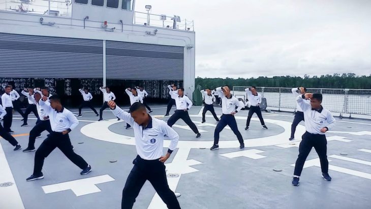 Jakarta, PUBLIKASI – Berada jauh dari pangkalan tidak menyurutkan prajurit KRI Teluk Palu-523 untuk terus mengisi diri dengan kegiatan yang bertujuan untuk meningkatkan kompetensi prajurit sekaligus menjaga kebugaran tubuh. Saat lego jangkar di alur buoy 12 Sungai Mimika, Timika, prajurit KRI Teluk Palu-523 memanfaatkan hari Selasa (19/7) sebagai hari olah raga di lingkungan TNI AL dengan berlatih beladiri karate. Berjajar rapi di geladak helly, prajurit KRI TLU-523 dengan penuh semangat berlatih bela diri asal Jepang yang dilatih oleh Lettu Laut (P) Dwi Prasetyo.