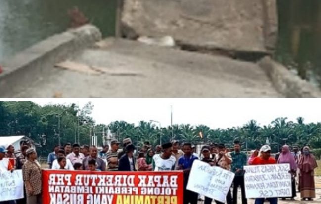 Langkat, PUBLIKASI – Ratusan warga masyarakat Kelurahan Pangkalan Batu Kecamatan Berandan Barat Kabupaten Langkat Sumatera Utara, Kamis (27/10/2022) menggelar aksi unjuk rasa menuntut manejemen PT Pertamina EP Pangkalan Susu memperbaikan jembatan Alur Lebah.