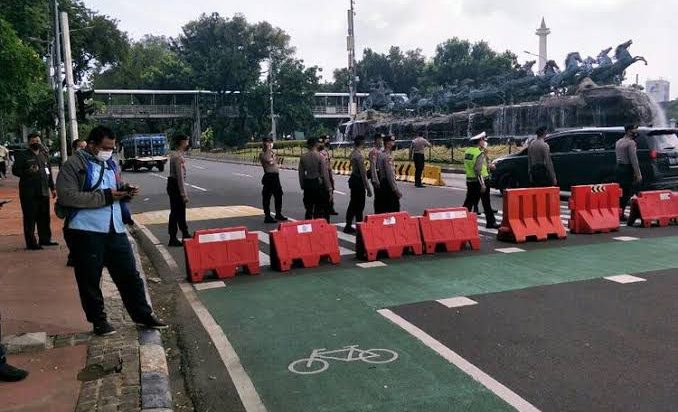Jakarta, PUBLIKASI – Polisi menutup Jalan Medan Merdeka Barat menuju ke Istana Negara imbas aksi demo yang digelar di Patung Kuda, Jakarta Pusat, Jumat (2/12).