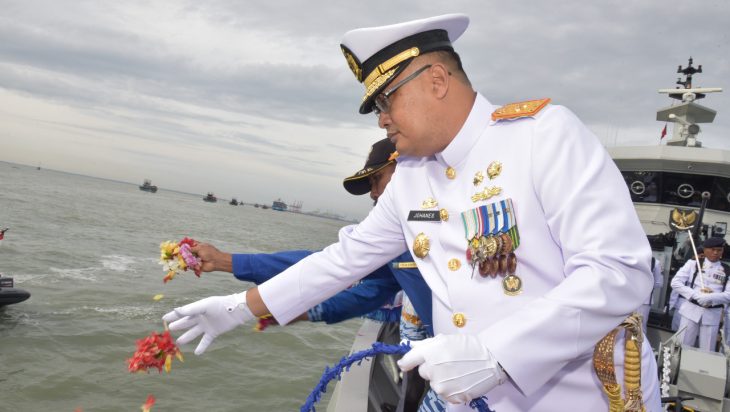Jakarta, PUBLIKASI – Pangkalan Utama TNI Angkatan Laut (Lantamal) I melaksanakan upacara peringatan Hari Dharma Samudera sebagai momentum untuk mengenang dengan mendoakan para pejuang pahlawan pertempuran laut yang telah mendharma-baktikan, nahkan merelakan hidupnya demi kejayaan bangsa dan negara. Upacara diselenggarakan di dua tempat yaitu di Perairan Belawan dengan menggunakan KRI Torani-860 yang dipimpin langsung oleh Danlantamal I Laksamana Pertama (Laksma) TNI Johanes Djanarko Wibowo sebagai Inspektur Upacara (Irup) dan Upacara di Dermaga Mako Lantamal I Belawan bertindak sebagai Irup Wadan Lantamal I Kolonel Marinir Sugianto, S.Sos., Jalan Serma Hanafiah No. 01, Belawan, Medan, Sumatera Utara, Senin (16/01/2023).
