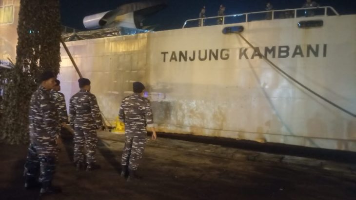 Turut hadir dalam penyambutan kedatangan Kapal Perang Republik Indonesia (KRI) Tanjung Kambani-971 yaitu Palaksa Lanal Palembang Letkol Laut (P) Yusan Taufik, Danden Pomal Lanal Palembang Mayor Laut (PM) Reza Ali Aksa, Pasintel Lanal Palembang Mayor Laut (E) Dedyan Basnur, Perwira Staf, serta Parajurit Lanal Palembang. (Andi Roesman Rola)