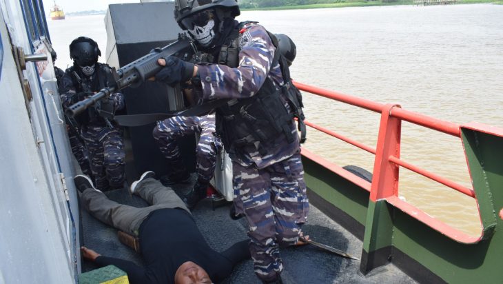 Palembang, PUBLIKASI – Tim Fleet One Quick Response (F1QR) Lanal Palembang berhasil melumpuhkan perompak diatas kapal SPOB Agung Bahari 8 di Perairan Pulau Kemarau Palembang, Kamis (25/05/2023).