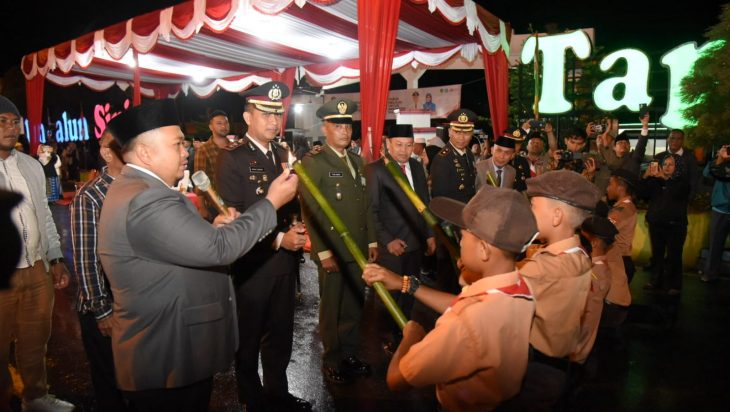 Tentu pemandangan yang tidak biasa ini menjadi pusat perhatian ribuan masyarakat yang hadir saat mengikuti penetapan waktu (Taptu) atau pawai obor yang diikuti dari berbagai pelajar dan elemen masyarakat.