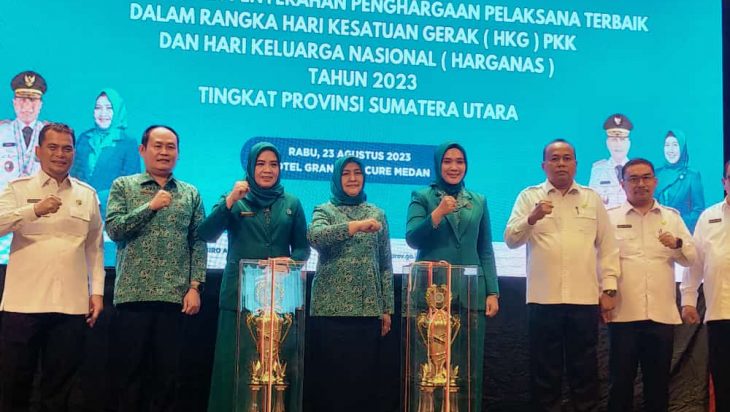 Penyerahan penghargaan tersebut diserahkan langsung oleh Ketua TP PKK Provinsi Sumut Nawal Lubis kepada Ketua TP PKK Kabupaten Tapsel Ny Rosalina Dolly Pasaribu dalam rangka perlombaan Hari Kesatuan Gerak (HKG) PKK dan Hari Keluarga Nasional (Harganas) Tahun 2023 tingkat Provinsi Sumut di Hotel Grand Mercure, Jalan Sutomo No 1 Medan, Rabu (23/8).