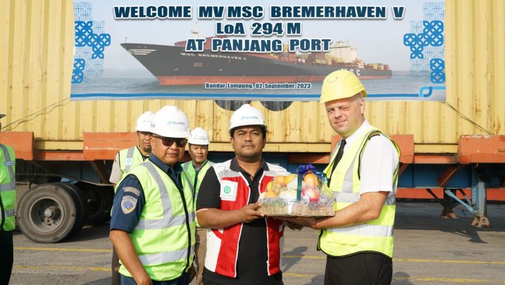 Bandar Lampung, PUBLIKASI – Kapal MV MSC Bremerhaven V berbendera Portugal sandar di Dermaga Terminal Peti Kemas Pelabuhan Regional 2 Panjang Bandar Lampung, Sabtu, 2 September 2023. Dengan Length over All (LoA) Kapal sepanjang 294 meter dan total Gross Tonage mencapai 49.477 Ton, kapal ini merupakan jenis New Panamax dengan kapasitas teus yang dapat diangkut adalah 14.500 teus, ini merupakan kapal peti kemas terpanjang yang pernah sandar di dermaga Petikemas yang dikelola PT Pelabuhan Indonesia (Persero) Regional 2 Panjang. Acara yang digelar di area Dermaga 100 Terminal Petikemas Pelabuhan Regional 2 Panjang ini dihadiri langsung General Manager Pelindo Regional 2 Panjang Imam Rahmiyadi beserta jajaran management didampingi Manager Area IPC TPK Area Panjang Budi Daryono beserta jajaran management. Turut menghadiri kegiatan ini yakni Kepala KSOP Kelas 1 Panjang Kolonel Marinir. Amrul Adriansyah, S.E., M.H., Kepala Balai Karantina Pertanian Kelas 1 Bandar Lampung Donny Muksydayan, Kepala KPP Bea & Cukai TMP B Bandar Lampung Arif. Kapal MV MSC Bremerhaven V ini bertolak dari Pelabuhan Tanjung Pelepas Malysia dan selanjutnya menuju Pelabuhan Tanjung Priok Jakarta. Setelah Kapal sandar dengan sempurna kegiatan diawali dengan mengundang Captain Kapal MV MSC Bremerhaven V Glib Putilin Turun kearea Dermaga Pelabuhan Regional 2 Panjang dan dilanjutkan dengan pemberian salam selamat datang disambung pemberian cinderamata secara simbolis oleh General Manager beserta tamu undangan yang hadir.