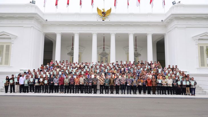 Jakarta, PUBLIKASI – Presiden Republik Indonesia (RI), Joko Widodo didampingi Menteri Agraria dan Tata Ruang/Kepala Badan Pertanahan Nasional (ATR/BPN), Hadi Tjahjanto menyerahkan 2.550.800 sertipikat tanah serentak se-Indonesia, pada Senin (04/12/2023). Penyerahan sertipikat berlangsung secara daring dan luring di Istana Negara, Jakarta.