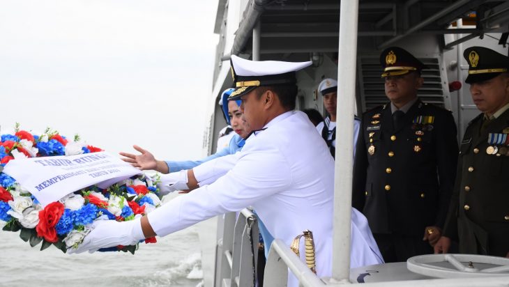 Tanjung Balai, PUBLIKASI – Danlanal TBA Letkol Laut (P) Wido Dwi Nugraha, S.E., M.Tr.Opsla., memimpin Upacara Tabur Bunga memperingati Hari Dharma Samudera Tahun 2024 diatas KAl Pandang I-1-72 sambil berlayar di Perairan Kuala Bagan Asahan, Senin (15/01/2024).