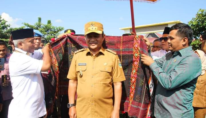 Pantauan PUBLIKASI, Kedatangan Pj Gubsu disambut hangat dan lalu digobak (Diselimuti) oleh plt Bupati Palas Ahmad Zarnawi Pasaribu bersama Ketua DPRD Palas Amran Pikal Siregar S.Sos.I. dengan pakaian adat yaitu “PAROPPA SADUN” di halaman Gor “BERCAHAYA” Kabupaten Padang Lawas.