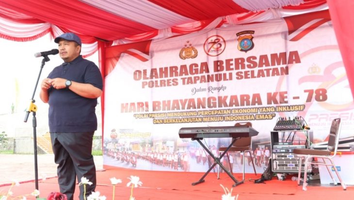 Bupati Tapanuli Selatan (Tapsel) Dolly Pasaribu dan Forkopimda begitu kompaknya mengikuti olahraga bersama dalam rangka memperingati Hari Ulang Tahun (HUT) Bhayangkara ke-78 di Markas Polisi Resort Tapanuli Selatan (Mapolres Tapsel), Desa Kilang Papan, Kecamatan Sipirok, Rabu (26/6).