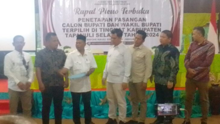 Yang dihadiri oleh segenap Forum Komunikasi Pimpinan Daerah (FKPD), Pasangan Calon Bupati dan Wakil Bupati Tapanuli Selatan, Bawaslu Tapsel, pimpinan partai politik PPK se-Tapsel serta undangan lainnya. Ketua KPUD Tapanuli Selatan Zulhajji Siregar membacakan surat keputusan KPUD tentang pemenangan pemilihan bupati dan wakil Bupati Tapanuli Selatan pada pilkada serentak 2024. Yakni pasangan calon no urut 01 H. Gus Irawan Pasaribu S.E, Aka/Japar Sahabuddin Ritonga dengan jumlah suara 97.004 pada angka 61%.