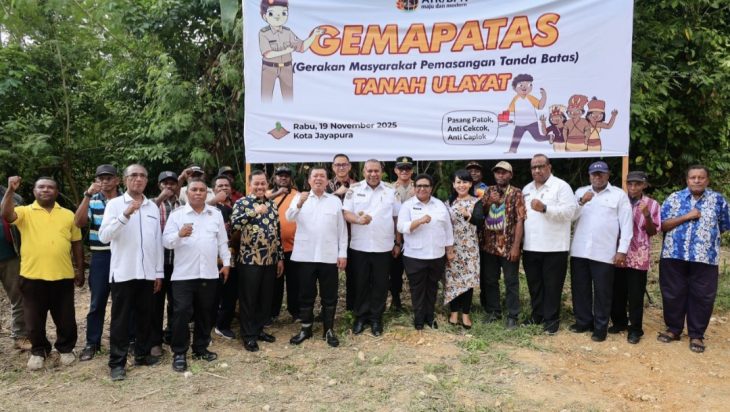 Jayapura, KORANPUBLIKASI.ID – Pelaksanaan Gerakan Masyarakat Pemasangan Tanda Batas (GEMAPATAS) di Skouw Yambe, Distrik Muara Tami, jadi langkah percepatan pendaftaran tanah ulayat di Papua. Menteri Agraria dan Tata Ruang/Kepala Badan Pertanahan Nasional (ATR/BPN), Nusron Wahid, hadir menyaksikan pemasangan patok tanda batas tersebut pada Rabu (19/11/2025), sebagai bagian dari penetapan batas-batas tanah adat sebelum proses administrasi pendaftaran tanah dilakukan.