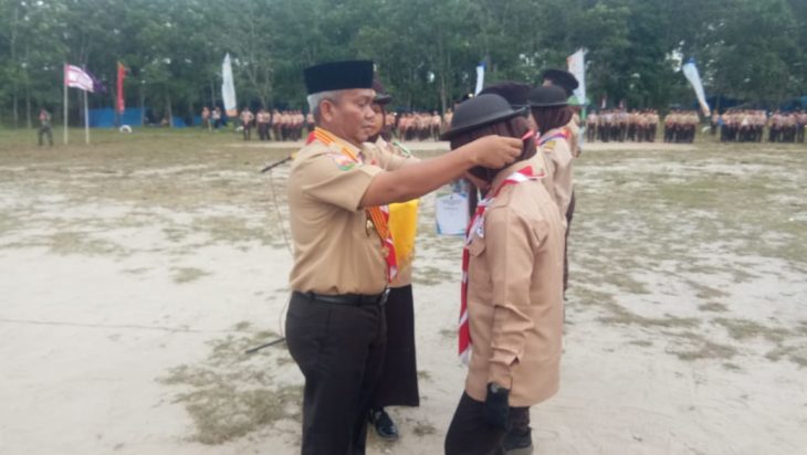 Dikesempatan itu Plt Bupati Padang Lawas, H. Ahmad Zarnawi Pasaribu menyematkan tanda peserta keanggotaan secara simbolis kepada tiga orang peserta pramuka.