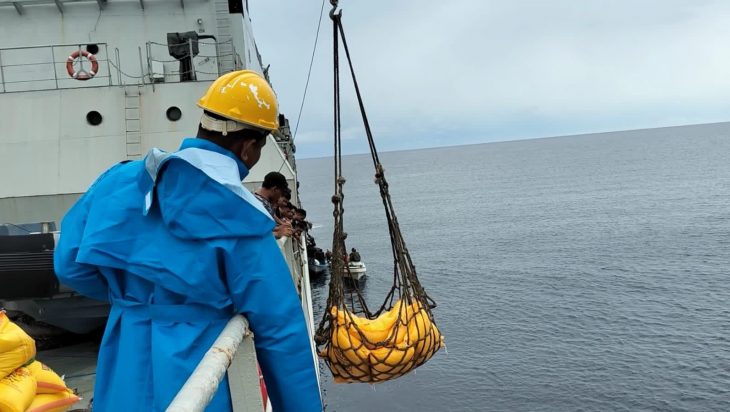 Jakarta, PUBLIKASI – Di tengah penugasannya dalam rangka mendukung Angkutan Laut Militer Satuan Tugas Pengamanan Pulau Terluar (Satgas Pam Puter) wilayah Timur, salah satu kapal perang jajaran Komando Lintas Laut Militer yaitu KRI Teluk Bintuni-520 yang saat ini berada di Biak bekerja sama dengan Pemerintah Daerah setempat memberikan dukungan pengiriman bantuan logistik kepada warga masyarakat yang berada di Pulau Fanildo, Senin (4/9). Bantuan logistik berupa beras sebanyak 4-ton diberikan oleh Pemerintah Kabupaten Supiori guna memenuhi kebutuhan pangan bagi masyarakat yang berada di pulau terluar yang memiliki kendala dalam pemenuhan kebutuhan logistik berupa bahan makanan.