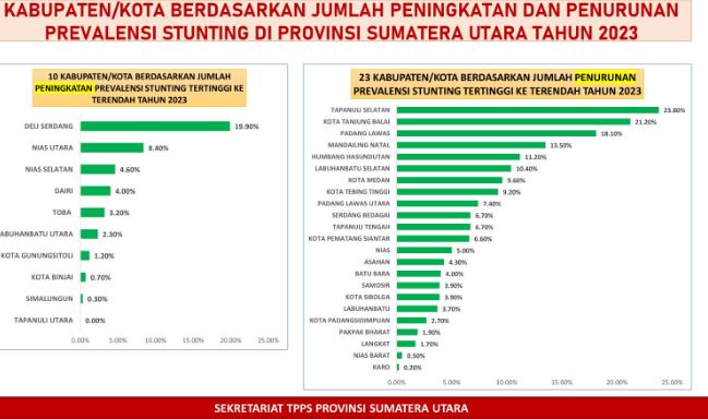 Artinya selama satu tahun Kabupaten Tapsel berhasil menurunkan 23,8 persen yang mana hasil ini menempatkan Kabupaten Tapsel menjadi kabupaten dengan angka penurunan prevalensi stunting paling baik se-Provinsi Sumut sebesar 23,8 persen disusul Kota Tanjung Balai sebesar 21,20 persen dan Kabupaten Padang Lawas sebesar 18,10 persen.