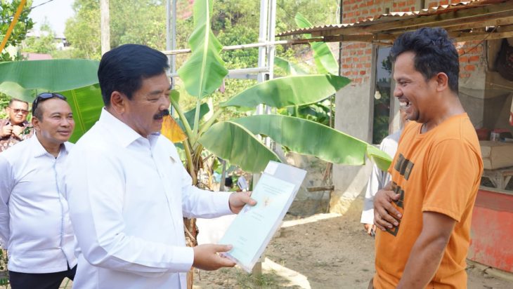 Balikpapan, PUBLIKASI – Menteri Agraria dan Tata Ruang/Kepala Badan Pertanahan Nasional (ATR/BPN), Hadi Tjahjanto menyerahkan sertipikat tanah hasil program Pendaftaran Tanah Sistematis Lengkap (PTSL) secara _door to door_, pada Rabu (01/11/2023). Penyerahan sertipikat berlangsung di Kelurahan Manggar, Kecamatan Balikpapan Timur, Kota Balikpapan.
