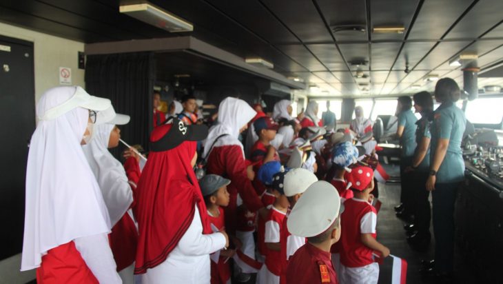 Jakarta, PUBLIKASI – Keberadaan Kapal Perang yang merupakan simbol eksistensi TNI Angkatan Laut menjadi salah satu tujuan wisata edukasi yang mampu menarik minat generasi muda terutama bagi para pelajar sekolah di semua strata pendidikan. Kali ini, Komando Lintas Laut Militer menerima kunjungan dari para pelajar Yayasan Islam Nafats Audhi Raudhatul Athfal Senyum Muslim Cikarang guna melihat dan mengenal langsung salah satu kapal perang Kolinlamil yakni KRI Banda Aceh-593 yang saat ini tengah sandar di dermaga Mako Kolinlamil, Tanjung Priok, Jakarta Utara, Rabu (9/8).