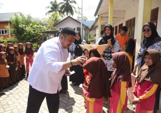 Tapanuli Selatan, PUBLIKASI — Guna menstimulus semangat belajar, Bupati Tapanuli Selatan (Tapsel), Dolly Pasaribu, beri susu gratis kepada anak-anak Sekolah Dasar (SD) Negeri 101112 Sipange, Kecamatan Sayur Matinggi, Jumat (17/5).