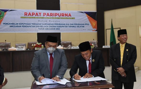 TAPSEL, PUBLIKASI – Bupati Tapanuli Selatan (Tapsel), H Dolly Pasaribu, dan Ketua DPRD, Husin Sogot Simatupang, menandatangi nota kesepakatan perubahan kebijakan umum anggaran (KUA) dan perubahan prioritas plafon anggaran sementara (PPAS) TA 2022. Penandatanganan dilakukan di Ruang Sidang Paripurna DPRD Tapsel, Jalan Prof Lafran Pane, Komplek Perkantoran Pemkab Tapsel, Sipirok, (5/9).