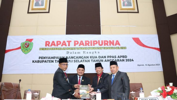 Tapsel, PUBLIKASI – Bupati Tapanuli Selatan (Tapsel) Dolly Pasaribu yang diwakili oleh Wakil Bupati Rasyid Assaf Dongoran menyampaikan rancangan kebijakan umum APBD dan prioritas plafon anggaran sementara (KUA-PPAS) tahun anggaran (TA) 2024 pada rapat paripurna di Gedung DPRD Kabupaten Tapanuli Selatan, Jalan Prof. Lafran Pane, Sipirok, Senin (14/8).