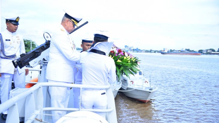 Pontianak, PUBLIKASI – Komandan Pangkalan Utama TNI Angkatan Laut (Danlantamal) XII Laksamana Pertama TNI Agoeng MKS memimpin jalannya upacara Tabur Bunga di Laut dalam rangka memperingati Hari Armada RI Tahun 2023 diatas Kapal Perang Republik Indonesia KRI Karotang-872 dari titik Dermaga Satuan Kapal Patroli (Satrol) Lantamal XII Jl. Komodor Yos Sudarso No. 1 Pontianak Kalimantan Barat, Rabu (29/11/2023).