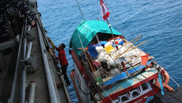 Menindaklanjuti arahan dan penekanan Pemimpin TNI AL, KRI Banjarmasin-592 yang saat ini sedang melaksanakan operasi dukungan angkutan laut militer Satgas Pamtas Papua ketika lintas laut di perairan Laut Arafuru berbagi bahan makanan dan obat-obatan kepada kapal-kapal ikan yang ditemui, Senin (21/3).