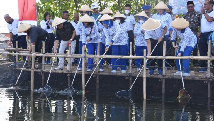 Usai menyampaikan sambutannya, Kepala Staf Kolinlamil bersama masyarakat pesisir dan Jalasenastri Kolinlamil meninjau lahan tambak budidaya perikanan tersebut dan secara simbolis bersama jajaran Kolinlamil melakukan panen dengan mengambil ikan menggunakan jaring angkat. (Andi RR)