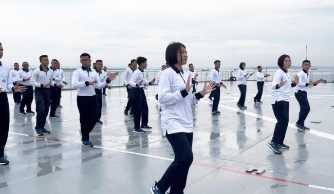 Balikpapan, PUBLIKASI — Demi menjaga kebugaran fisik dan psikis yang bahagia seluruh prajurit KRI Banjarmasin-592 selalu melaksanakan olahraga, salah satunya adalah melaksanakan senam bersama di Geladak Heli KRI BJM yang sedang Lego di perairan Balikpapan, pada hari Rabu (12/6).
