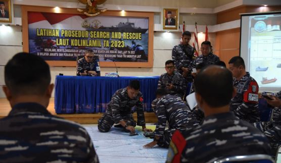 Jakarta, PUBLIKASI-Jelang pelaksanan Manuver Lapangan (manlap) pada Latihan Prosedur Search and Rescue (SAR) Laut Kolinlamil tahun 2023, Komandan Satuan Lintas Laut Militer 1 Kolonel Laut (P) Yohanes Upang Komandan Satuan Tugas SAR Kolinlami tahun 2023 memimpin pelaksanaan kegiatan Tactical Floor Game (TFG) yang berlangsung di gedung Laut Natuna, Mako Kolinlamil, Tanjung Priok, Jakarta Utara, Selasa (24/10). TFG digelar guna memastikan kembali seluruh pelaku yang tergabung dalam Satuan Tugas SAR Kolinlami tahun 2023 memahami seluruh rangkaian kegiatan di geladi lapangan menit per-menitnya sehingga ada gambaran tentang situasi yang akan mereka hadapi nanti.