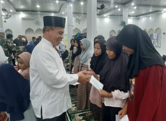 Terlihat Kakan Kemenag ikut menyantuni anak yatim serta menyerahkan tikar Gulung berupa Ambal kepada BKM Al – Mardiyah bersama Sekda Palas, Arpan Nasution S.Sos, Waka Polres Sugianto S.Pdi,