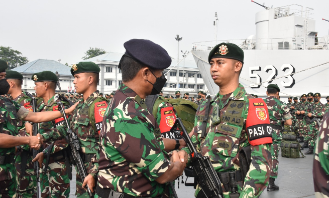 Jakarta, PUBLIKASI – Hadir di lapangan Mulyono Silam, Mako Kolinlamil, Tanjung Priok, Jakarta Utara Kepala Staf Komando Lintas Laut Militer Laksma TNI Retiono Kunto mewakili Panglima Komando Lintas Laut Militer Laksda TNI Erwin S. Aldedharma menghadiri upacara pemberangkatan pasukan Batalyon Infanteri Raider 321/Galuh Taruna dan Batalyon Infanteri Mekanis 203/Arya Kamuning yang tergabung dalam Satuan Tugas Pengamanan Perbatasan RI-PNG tahun 2022 dengan menggunakan KRI Teluk Palu-523, Senin (6/6). Upacara pemberangkatan pasukan Satgas Pamtas dipimpin oleh Panglima Divisi Infanteri 1 Kostrad Mayjen TNI Bobby Rinal Makmun.