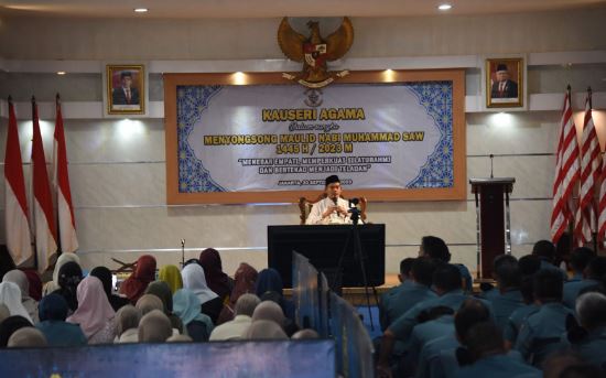 Jakarta, PUBLIKASI – Dalam rangka memperingati Maulid Nabi Muhammad SAW tahun 1445 H/ 2023 M, jajaran Komando Lintas Laut Militer melaksanakan Kusri Agama Islam yang berlangsung di gedung Laut Natuna, Mako Kolinlamil, Tanjung Priok, Jakarta Utara, Rabu (20/9). Peringatan Maulid Nabi Muhammad SAW tahun ini mengambil tema “Menebar Empati, Memperkuat Silaturahmi dan Bertekad menjadi Teladan”. Hadir dalam kegiatan tersebut Panglima Kolinlamil Laksda TNI Edwin, S.H., M.Han., M.H., Inspektur Kolinlamil, Pejabat Utama dan Kasatker Kolinlamil, Ketua Gabungan Jalasenastri Kolinlamil Ny. Wenny Edwin beserta para Pengurus Gabungan Jalasenastri Kolinlamil dan prajurit serta PNS Kolinlamil yang beragama Islam.