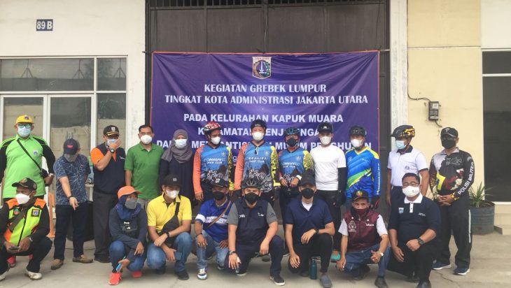 Dengan bersepeda, rombongan Forkopimda Jakarta Utara memantau kegiatan pengerukan lumpur dan sampah di penampungan air yang juga danau resapan Embung Nein, Penjaringan.