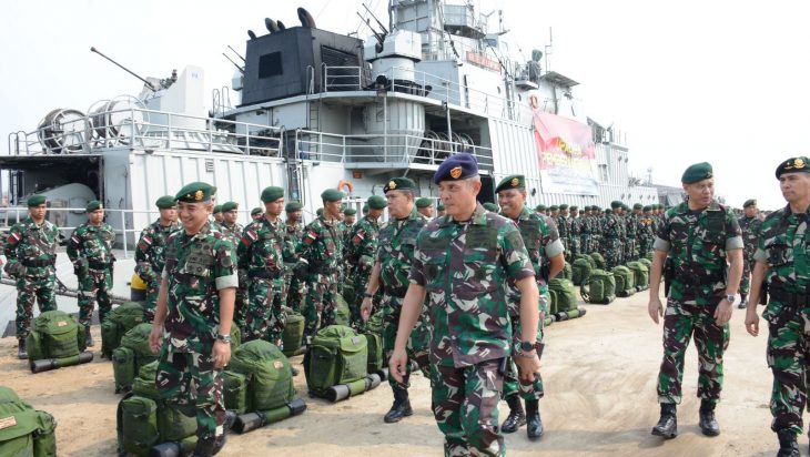 Jakarta, PUBLIKASI — Asisten Operasi Panglima Komando Lintas Laut Militer Kolonel Laut (P) Ronald Rarun mewakili Panglima Komando Lintas Laut Militer Laksda TNI Yayan Sofiyan menghadiri upacara pemberangkatan pasukan Batalyon Artileri Medan 10/1/1 Kostrad yang tergabung dalam Satuan Tugas Pengamanan Perbatasan (Satgas Pamtas) RI-Malaysia dengan menggunakan KRI Teluk Lampung-540 yang dilaksanakan di dermaga Bogasari, Tanjung Priok, Jakarta Utara, Jumat (19/5). Upacara pemberangkatan pasukan Satgas Pamtas ini dipimpin langsung oleh Panglima Divisi Infanteri I Kostrad Mayjen TNI Bobby Rinal Makmun dan pada kesempatan itu turut pula hadir Panglima Kostrad Letjen TNI Maruli Simanjuntak.
