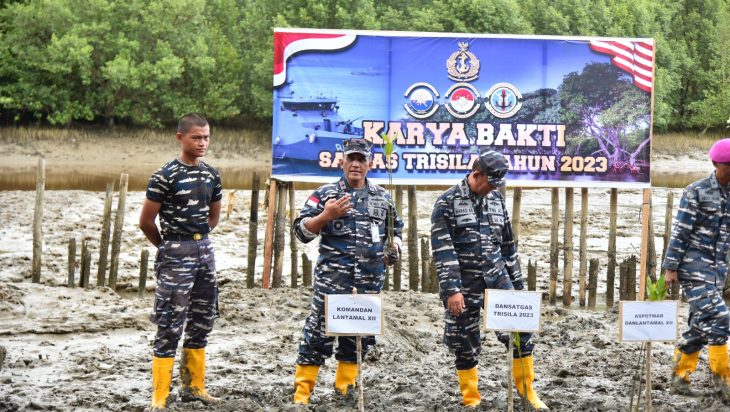 Kegiatan penanaman mangrove di Desa Sungai Bakau Besar Laut merupakan rangkaian dari Karya Bakti Satgas Operasi Trisila 2023 yang hadir di Lantamal XII demi menunjukkan eksistensi Koarmada RI di Perairan Indonesia dan dilaksanakan menyeluruh di semua wilayah perairan yurisdiksi nasional.