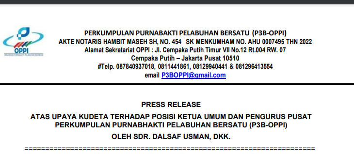 Pengurus Pusat P3B-OPPI memutuskan untuk menunda Sdr. DU masuk pada kepengurusan Pengurus Pusat P3B – OPPI Periode 2024-2027. 6. Bahwa adanya Keputusan pada angka 5 di atas, pada tanggal 13 Februari 2025, Sdr. DU melakukan SOMASI kepada Pengurus Pusat P3B-OPPI. Tidak cukup dengan SOMASI, juga pada tanggal 5 Juli 2025, mengajukan gugatan perdata kepada Pengurus Pusat P3B-OPPI melalui Pengadilan Negeri Jakarta Pusat. Inti isi somasi dan gugatan, antara lain : a. Menyatakan Ketua Umum mengundurkan diri;b. Menuntut dilaksanakan Munaslub untuk mencabut mandat Pengurus Pusat;c. Mencabut / membekukan SK Pengurus Pusat P3B-OPPI;d. Mengangkat Pengurus Pusat baru melalui Munaslub. 7. Bahwa Somasi dan Gugatan sementara berproses, tiba-tiba Sdr. DU melakukan Upaya Kudeta dengan membentuk Pengurus P3B-OPPI dengan Ketua Umum, Sdr. DU yang diklaim berdasarkan Hasil Munaslub Bekasi sebagaimana diuraikan di atas. 8. Bahwa atas upaya kudeta oleh Sdr. DU di atas, Pengurus Pusat P3B-OPPI mengambil sikap sebagai berikut : a. Tetap menjalankan roda organisasi dengan program-program sesuai Amanah Munas I P3B-OPPI pada 12 September 2024, di Ciawi, Bogor, untuk perbaikan kesejahteraan anggota pensiunan; b. Terus membangun komunikasi dengan mitra strategis, antara lain, Direksi PT Pelabuhan Indonesia (Persero), Direksi PT Dapen Pelindo, dan mitra strategis lainnya; c. Memperkuat konsolidasi internal anggota P3B-OPPI Hasil Munas I di Ciawi, Bogor; d. Melaksanakan proses adminstrasi organisasi yang diperlukan. 9. Semoga Allah SWT / Tuhan YME memberkahi, melindungi, dan melancarkan segala urusan kita untuk satu tujuan kesejahteraan pensiunan Pelindo. Aamiin Yaa Rabbal’aalamiin. 10. Demikian Press Release Pengurus Pusat P3B-OPPI dibuat untuk kejelasan masalah yang sebenarnya. Tembusan Yth. : 1. DIireksi PT Pelabuhan Indonesia (Persero); 2. Direksi PT Dapen Pelindo3. Pembina P3B-OPPI; 4. Penasihat P3B-OPPI; 5. Para Ketua dan Pengurus Daerah Regional II dan IV P3B-OPPI; 6. Para Ketua dan Pengurus Cabang P3B-OPPI di Seluruh Indonesia P3B-OPPI. press release/ andy roesman rola
